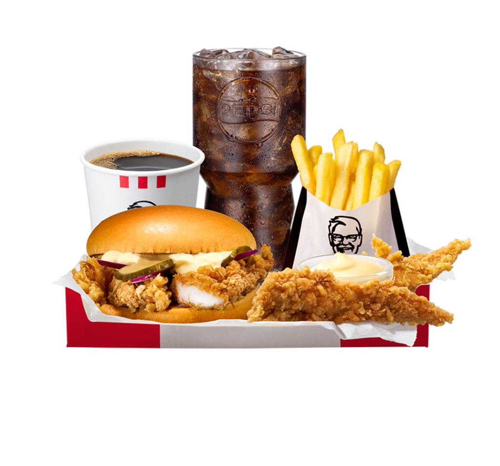 Kanahampurilainen, 2 Stripsiä, pienet ranskalaiset, dippi, pieni juoma ja kahvi (0,24l).